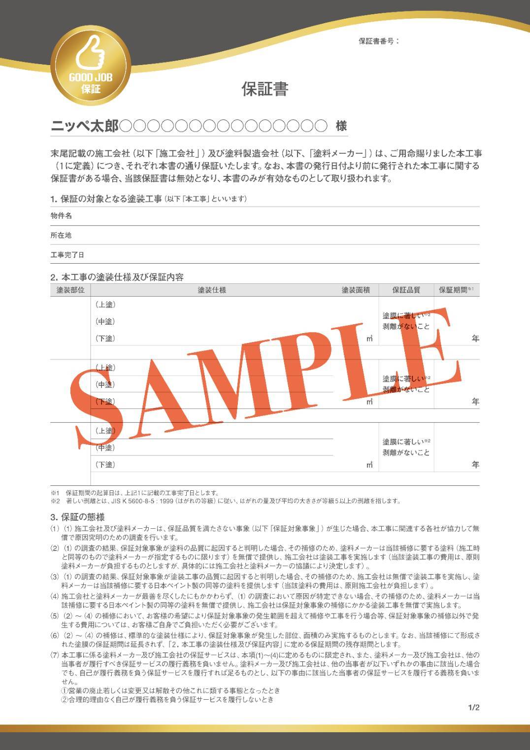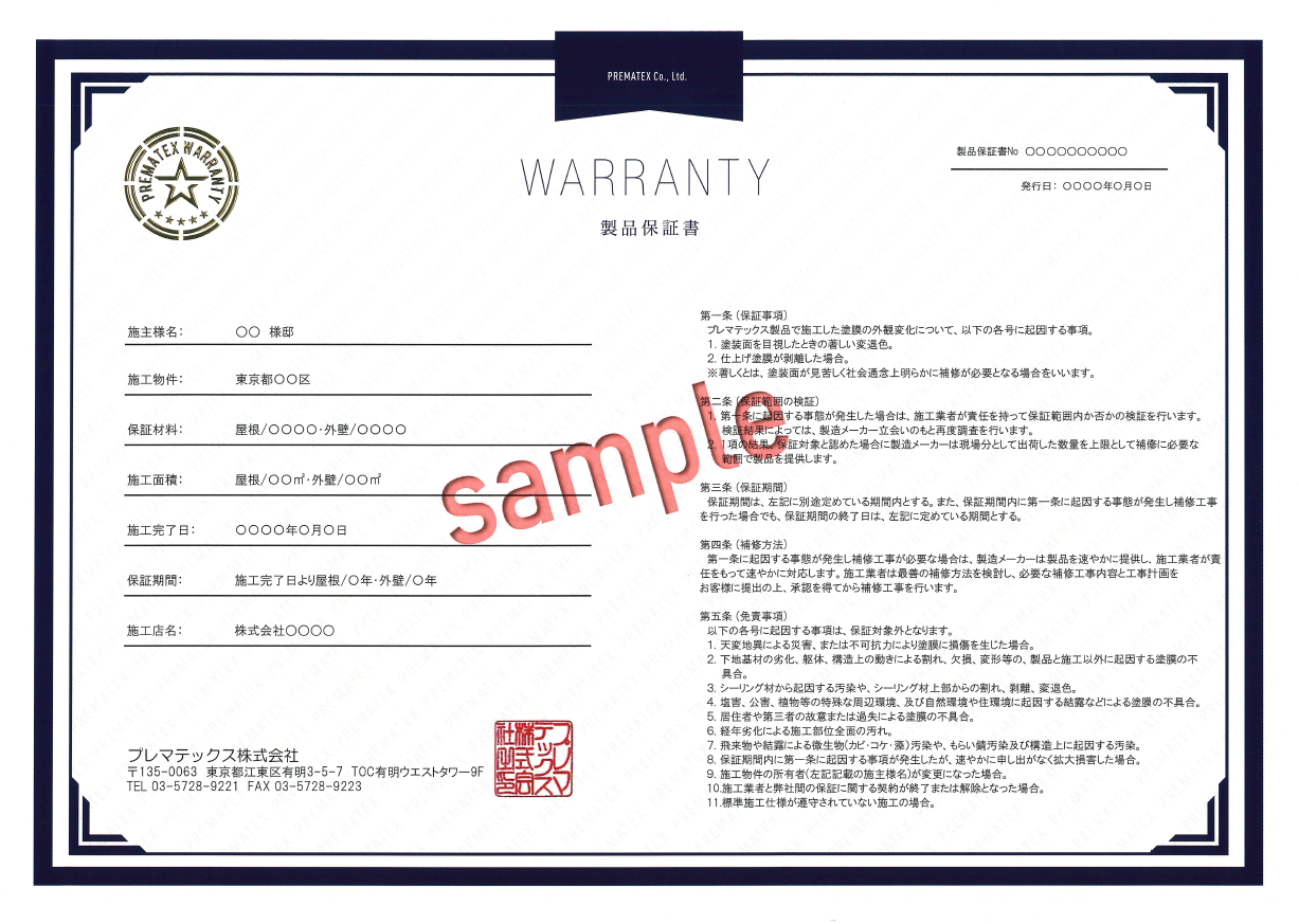 日本ペイントおよびプレマテックスのメーカー保証書をしっかりとご用意しております。