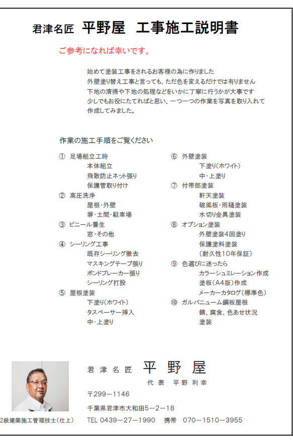 この工事説明書は、はじめて塗装工事をされるお客様にも安心していただけるように、