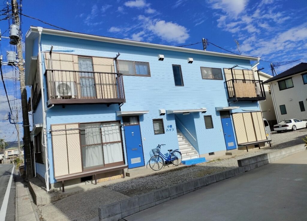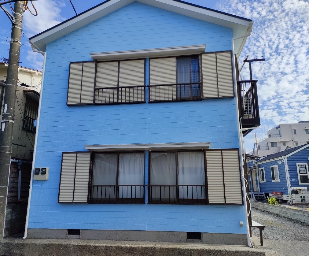 今回の塗り替えでは、鴨川の海をイメージした薄いブルーに塗り替えをおこないました。外観の印象がガラッと変わりオーナー様やご入居者様にもお喜びいただけました。